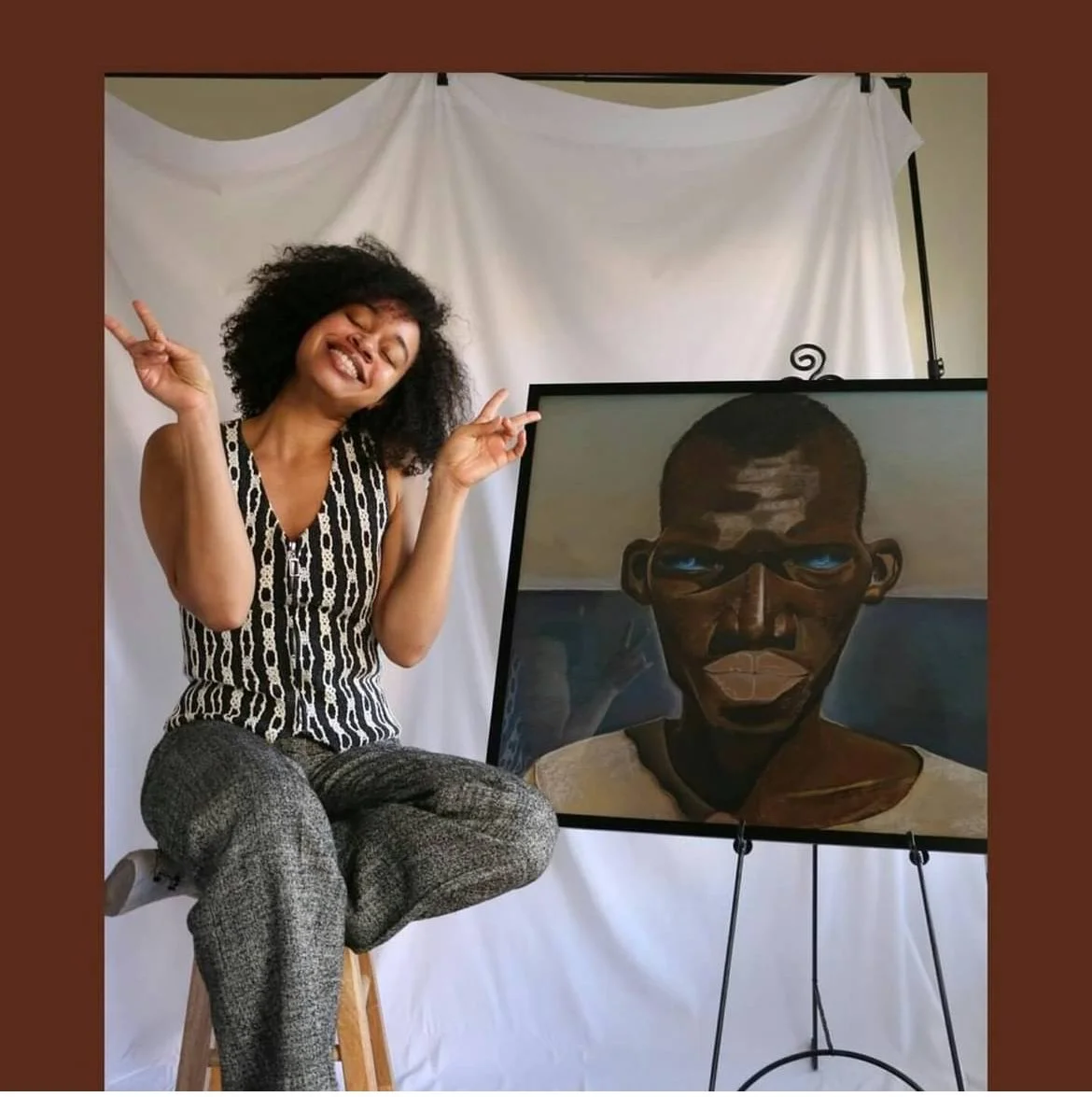 A youthful African refugee arrives to freedom. His dream of a better life has come into fruition. Determination can be seen in his strong gaze. The clouds and moons in his eyes represent his new found vision and purpose.